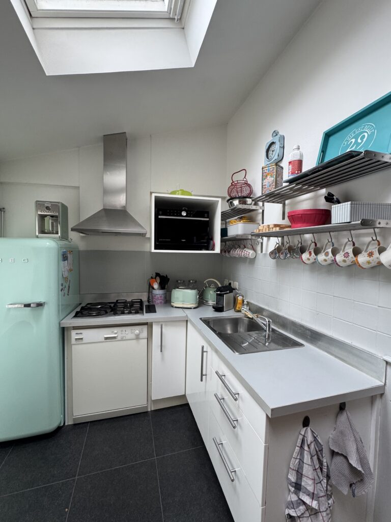 Ensuite vous avez la pièce de vie avec salon et télévision, table de bar haute avec tabourets pouvant accueillir 6 personnes et cuisine ouverte.